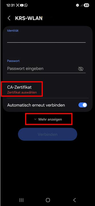 Beim Herstellen der Verbindung mit dem WLAN werden Angaben benötigt, die erst beim Ausklappen des Menüs über „Mehr anzeigen" erscheinen: