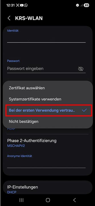 5. Als „CA-Zertifikat" ist folgende Einstellung zu wählen: „Bei der ersten Verbindung vertrauen"