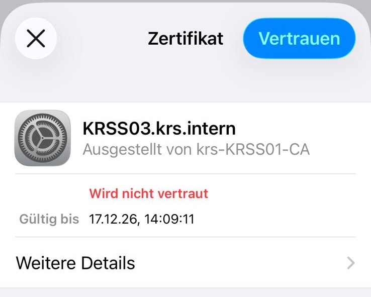 Es erscheint eine ähnliche Meldung zum Zertifikat, das auf einen Server der Schule ausgestellt wurde: