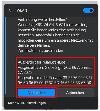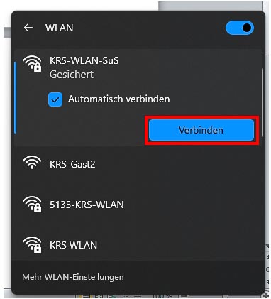 3. KRS-WLAN-SuS in Netzwerkumgebung auswählen und auf „Verbinden" klicken: