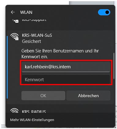 Der Benutzername für das Schulportal wird um die Endung @krs.intern ergänzt. Es ergibt sich folgender beispielhafter Benutzername für das WLAN: